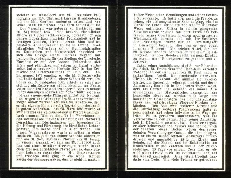 | Priesterweihe 24.8.1871; 9.9.1871 Rektor am städt. Hospital Neuss; 23.3.1888 Pfarrer in Gummersbach; Einrichtung von Rektoraten in Derschlag u. Dieringhausen; 28.11.1896 Pfarrer von St. Joseph, Viersen; 1899 Pfarrer St. Dreifaltigkeit, Düsseldorf; Neubau mehrerer Kirchen; Roter Adlerorden 4. Kl. |