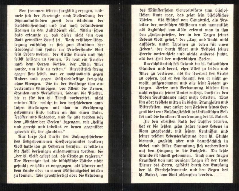 | Priesterweihe 5.6.1841; 1841 Kaplan in Haltern, 1845 Subregens Priesterseminar Münster; 1852 Generalvikar Münster; 1857 Bischof von Osnabrück, 1866 Erzbischof von Köln; im Kulturkampf Kerker u. Verbannung; 1885 Kardinal |