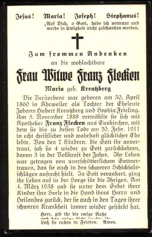 | Eltern: Johann Hubert Kreutzberg u. Sophia Frieling; ∞ 5.11.1888 Apotheker Franz Flecken aus Euskirchen, † 20.2.1911; 7 K., davon 4 †; |