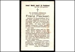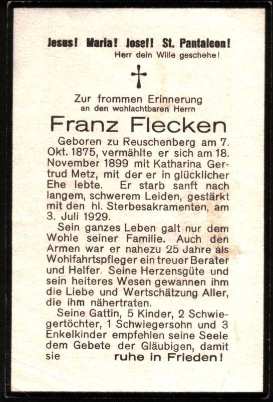 | ∞ 18.11.1899 Katharina Gertrud Metz; langes, schweres Leiden; 25 J. Wohlfahrtspfleger; 5 überlebende Kinder |