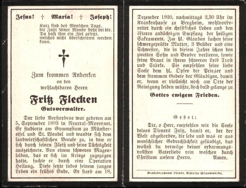 | Gymnasium zu Münstereifel und St. Wendel; Gutsverwalter; schweres Magenleiden, das er sich im 1. Weltkrieg zugezogen hat; |