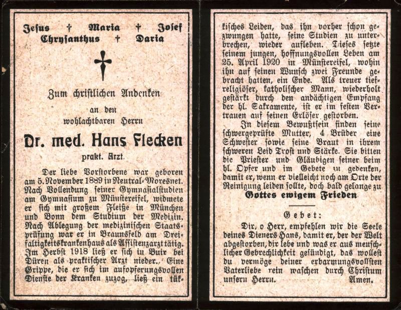 | Gymnasium Münstereifel; Assistenzarzt Dreifaltigkeitskrankenhaus Köln-Braunsfeld; seit Herbst 1918 praktischer Arzt in Buir b. Düren; verlobt |