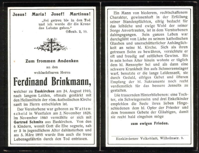 | Langes Leiden; ∞ Nov. 1860 Gertrud Schmitz aus Euskirchen, † 5.3.1895; 6 K., davon 5 †; lange Leidenszeit |