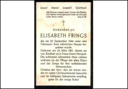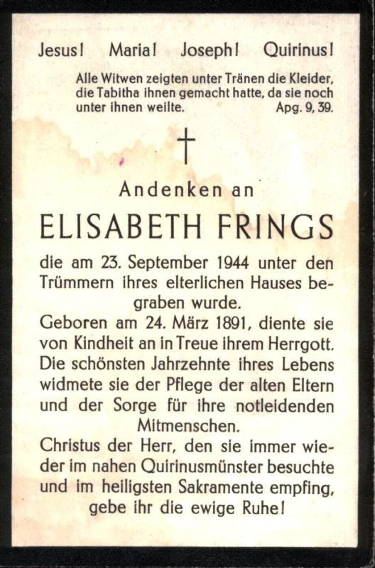 | Opfer 2. Weltkrieg; bei Luftangriff in Trümmern des elterlichen Hauses begraben; widmete sich der Pflege ihrer alten Eltern |