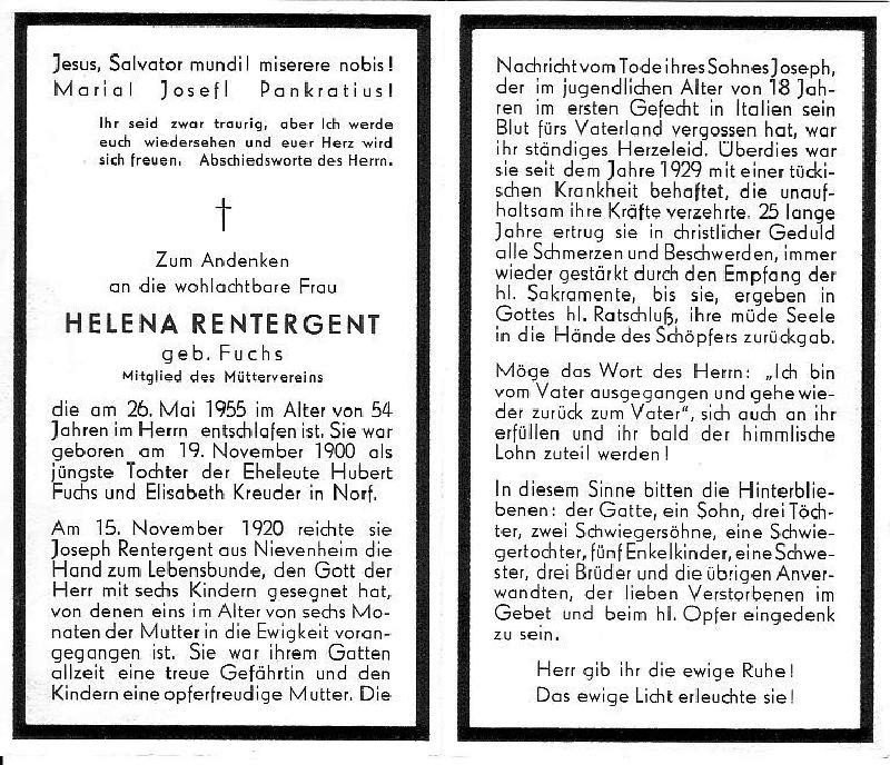 | Eltern: Hubert Fuchs u. Elisabeth geb. Kreuder; ∞ 15.11.1920 Joseph Rentergent aus Nievenheim; 6 K., davon 1 früh †; Soh n Joseph mit 18 J. im 2. Weltkrieg in Italien gefallen; seit 1929 unter tückischer Krankheit leidend; |