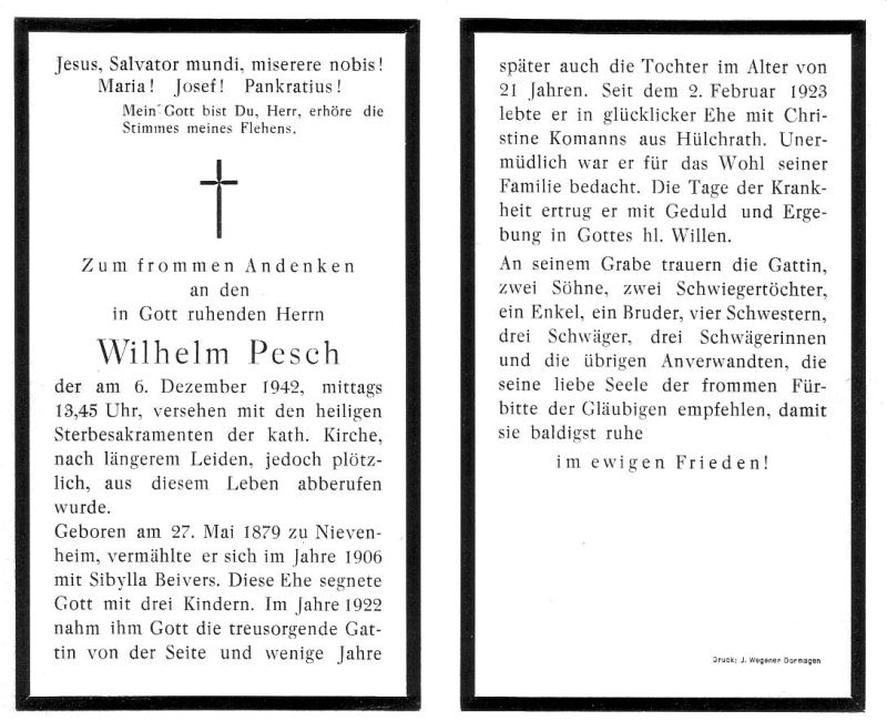 ∞ 1906 Sibylla Beivers, † 1922; 3 K., davon 1 Tochter mit 21 J. †; ∞ 2.2.1923 Christine Komanns aus Hülchrath |