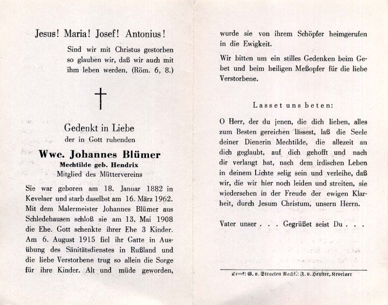 Mitgl. Mütterverein; ∞ 13.5.1908 Malermeister Johannes Blümer aus Schledehausen, am 6.8.1915 im 1. Weltkrieg in Russland als Sanitäter gefallen; ; 3 K. |