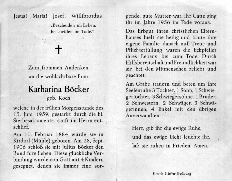 ∞ 28.9.1906 Julius Böcker, † 1956; 4 K.; Druck in Bedburg/Erft |