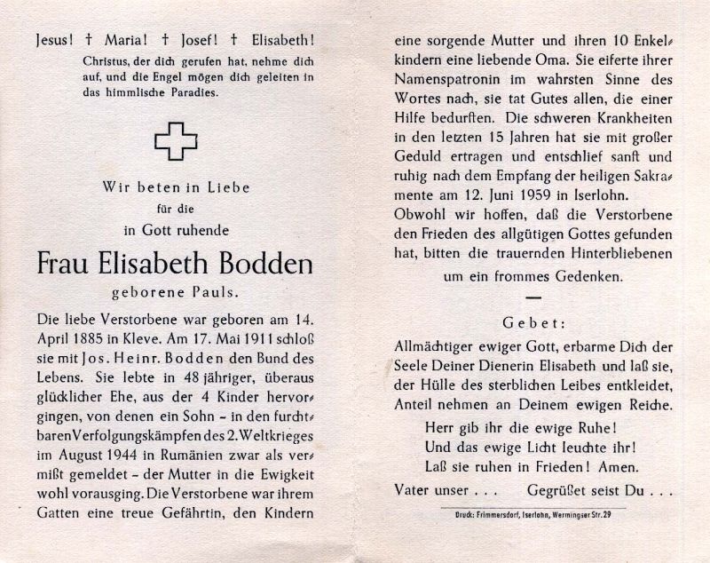 ∞ 17.5.1911 Josef Heinrich Bodden; 4 K., davon 1 Sohn seit August 1944 im 2. Weltkrieg in Rumä#nien vermisst; sc hwere Krankheit in den letzten 15 Jahren; Druck in Iserlohn |
