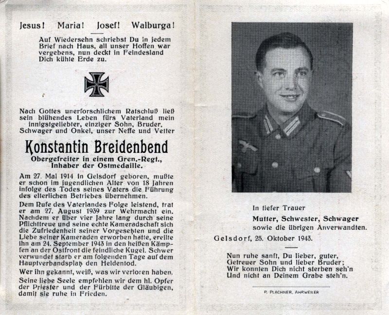 Gefallener 2. Weltkrieg; nach Tod des Vaters übernahm er mit 18i J. den väterl. Betrieb; 27.8.1939 zur Wehrmacht; am 24.9.1943 schwer verwundet; Druck in Ahrweiler |