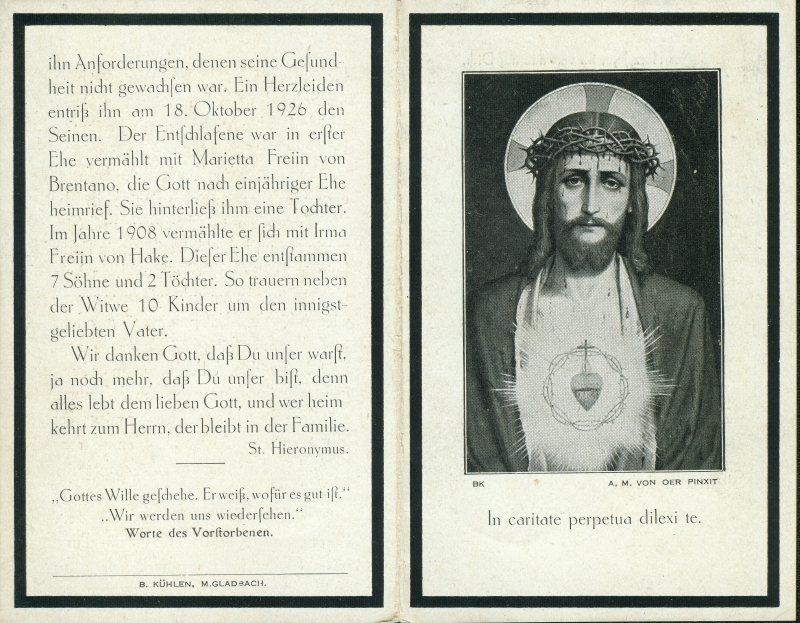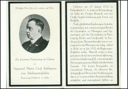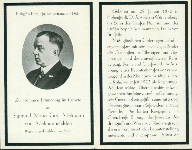 | Regierungs-Präsident in Köln; Eltern: Graf Heinrich Adelmann und Sophie Freiin von Brüsselle; ∞ Marietta Freiin von Brentano †; 1 K.; ∞ 1908 Irma Freiin von Hake; 9 K. |